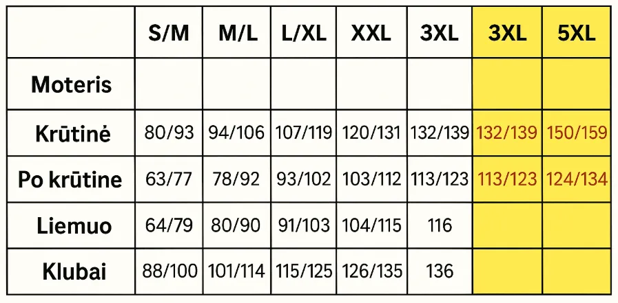 Dydžiai: SM, ML ( tempiasi iki 50d.)